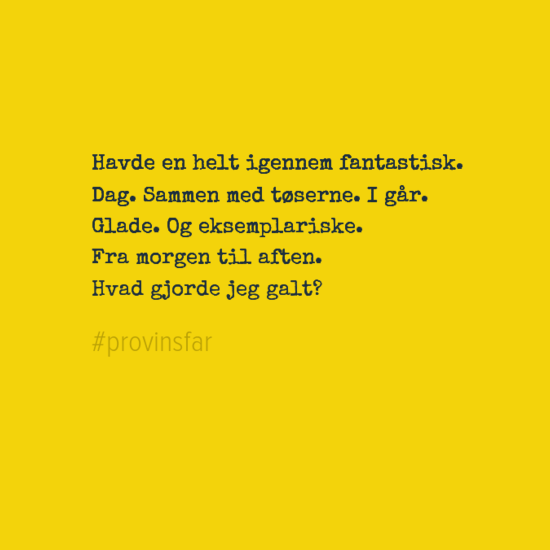 Kender I det der med at man for en gang skyld har fået ungerne passet. Med overnatning. Fredag. Udnyttes. I byen med konen. Hende den dejlige. Vild aften. I storbyen. Ud at spise. Restaurant. Stor i slaget. Ingen penge. Sludrer. Griner. Længe. Beruset. Af blå kings og rødvin. Som man siger. Kigger op. Alene i restauranten. Mest fordi klokken stadig kun er 16.30. Ingen normale mennesker. Åbenbart. Spiser på tidspunktet, hvor vi børnefamilier plejer at tænke i sultne. Og trætte maver…..
