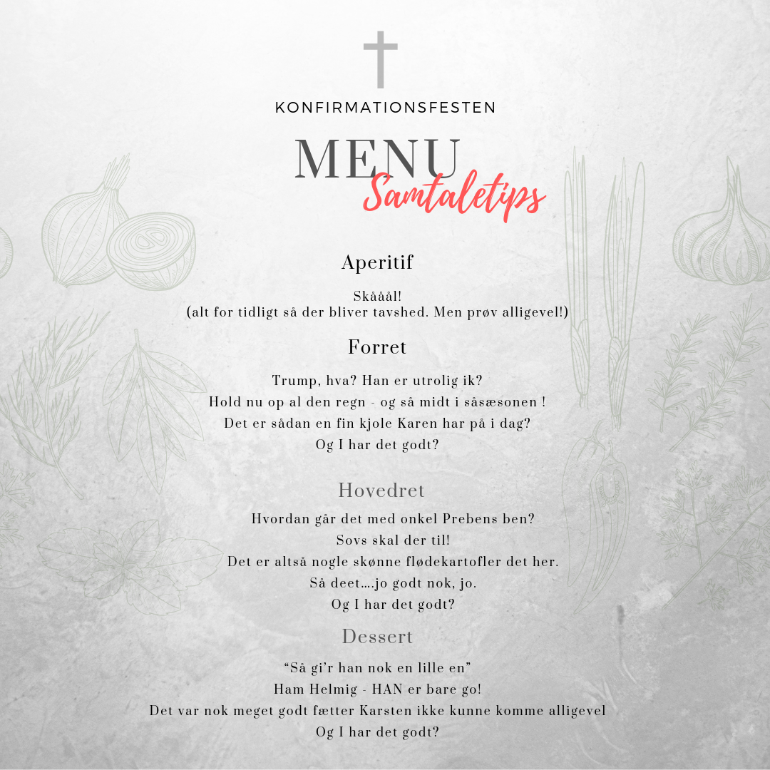 Konfirmationssæsonen er skudt igang. Det byder på dage med suppe, steg og sangskjuler. Her blot et par tips til at holde samtalen kørende i løbet af festen. Jeg modtager meget gerne supplerende indspark fra jer!